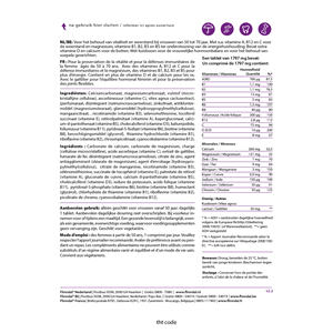 Calciumcarbonaat, magnesiumcarbonaat, vulstof (micro¬kristallijne cellulose), ascorbinezuur (vitamine C), vitex agnus cactusextract, ijzerfumaraat, disintegrant (natriumcrosscarmelose), zinkcitraat, antiklonter¬middel (magnesiumstearaat), glansmiddel (hydroxypropylmethylcellulose), mangaancitraat, , nicotinamide (vitamine B3), selenomethionine, tocoferol succinaat (vitamine E), retinolpalmitaat (vitamine A), kopergluconaat, calcium-d-pantothenaat (vitamine B5), cholecalciferol (vitamine D3), kaliumjodide, foliumzuur (vitamine B11), pyridoxal-5-fosfaat (vitamine B6), biotine (vitamine B8), bevochtigingsmiddel (glycerol), thiamine hydrochloride (vitamine B1), riboflavine (vitamine B2), chroompicolinaat, cyanocobalamine (vitamine B12).