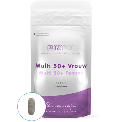 - Beide multivitaminen zijn geschikt voor mensen van 50 jaar en ouder. Het verschil tussen beide producten is dat Flinndal Multi 50+ Vrouw speciaal ontwikkeld is op basis van de voedingsstoffenbehoefte van vrouwen vanaf 50 jaar. Dit betekent dat we van bepaalde ingrediënten net iets meer of minder hebben toegevoegd. Zo vindt u in Flinndal Multi 50+ Vrouw een hogere dosering calcium en vitamine D. Daarnaast hebben we ook kuisboom toegevoegd ter ondersteuning van de overgang.