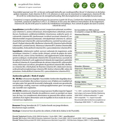 Flinndal Multi Vitaal Kauwtablet is speciaal voor 50+ en bij een verhoogde behoefte aan voedingsstoffen. Het bevat 12 vitaminen en de belangrijkste mineralen in een dosering tot 200% van de aanbevolen dagelijkse hoeveelheid. Eén kauwtablet per dag is een complete aanvulling op uw voeding. Op smaak gebracht met natuurlijke zoetstoffen. Mét druivenpitextract en natuurlijke kersensmaak.