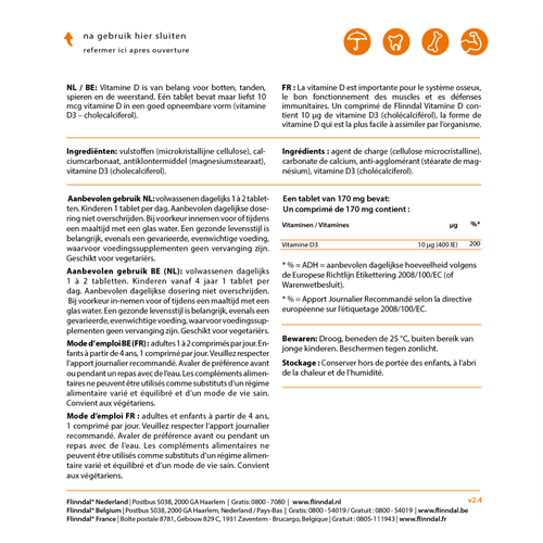 Flinndal vitamine D is gemaakt van cholecalciferol (D3). Deze vorm is beter opneembaar dan D2. De tabletjes hebben een krachtige dosering van maar liefst 10 mcg vitamine D3. Een verantwoorde dosering die goed aansluit bij de verhoogde behoefte van veel mensen in België. Meer informatie over de kwaliteit van Flinndal Vitamine D vindt u onder de tab kwaliteit.Kies voor kwaliteit