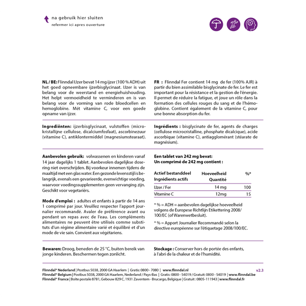 Le fer Flinndal a un dosage responsable. Il contient 14 mg de fer par comprimé. Cela représente 100 % de l'apport journalier recommandé. Un bon complément au régime alimentaire et pas trop non plus. La quantité maximale sûre de ce minéral est de 75 mg par jour.