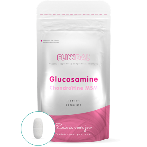 Ce produit contient 2000 mg de D-glucosamine sulfate 2KCl, dont 1183 mg de glucosamine élémentaire. En outre, le Flinndal glucosamine chondroïtine MSM contient également de la chondroïtine et du MSM. Ce sont des substances naturelles qui se trouvent également dans le corps et se trouvent souvent près de la glucosamine. Une excellente combinaison !