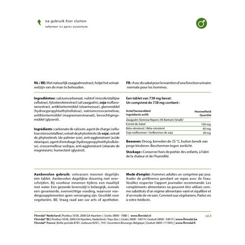 Flinndal Prosta Comfort heeft een zorgvuldig berekende samenstelling. Het bevat zaagpalm, bètasitosterol en soja-isoflavonen. Drie natuurlijke en plantaardige ingrediënten, u leest er meer over op de tab Kwaliteit.