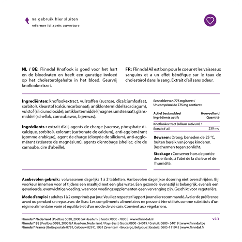 Flinndal Ail contient 250 mg d'extrait d'ail par comprimé, dont 12,5 mg d’alliine. C'est bon pour le cœur et les vaisseaux sanguins. Deux comprimés par jour ont un effet bénéfique sur le taux de cholestérol dans le sang. Sans odeur et convient aux végétariens.