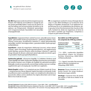 Citrate de magnésium, édulcorant naturel (saccharose), arôme naturel d’orange, anti-agglomérant (acide stéarique), acide ascorbique (vitamine C), édulcorant naturel (glycosides de stéviol de Stévia). Avec des édulcorants naturels.
