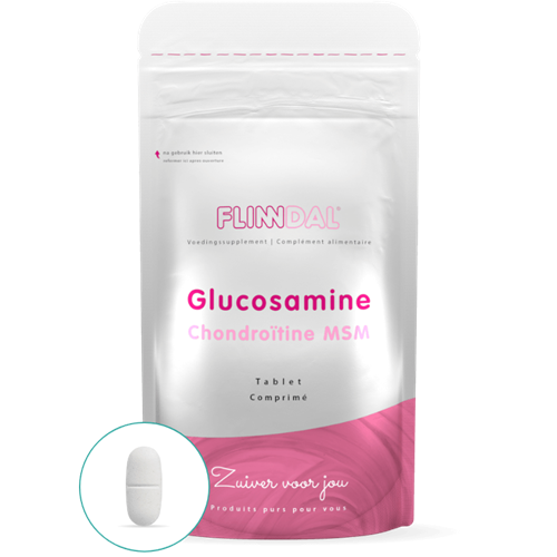 Ce produit contient 2000 mg de D-glucosamine sulfate 2KCl, dont 1183 mg de glucosamine élémentaire. En outre, le Flinndal glucosamine chondroïtine MSM contient également de la chondroïtine et du MSM. Ce sont des substances naturelles qui se trouvent également dans le corps et se trouvent souvent près de la glucosamine. Une excellente combinaison !