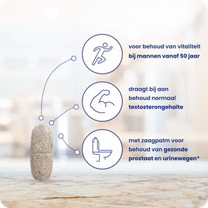 Voor het behoud van vitaliteit en weerstand bij mannen van 50 jaar tot 70 jaar. Met extra zink. Dit mineraal draagt bij aan het behoud van een normaal testosterongehalte in het bloed en helpt ook bij de opbouw van lichaamseiwit. Ook met zaagpalm voor het behoud van een gezonde prostaat en urinewegen.