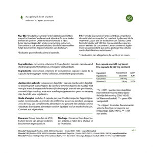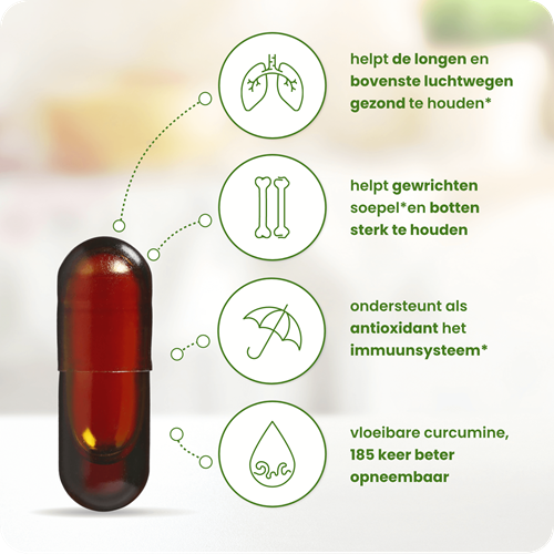 Curcumine is een plantaardige stof die de gewrichten soepel helpt te houden. Daarnaast is curcumine ook een antioxidant, die de lichaamscellen beschermt tegen invloeden van buitenaf. Aan de capsule is tevens vitamine D toegevoegd, voor sterke botten.